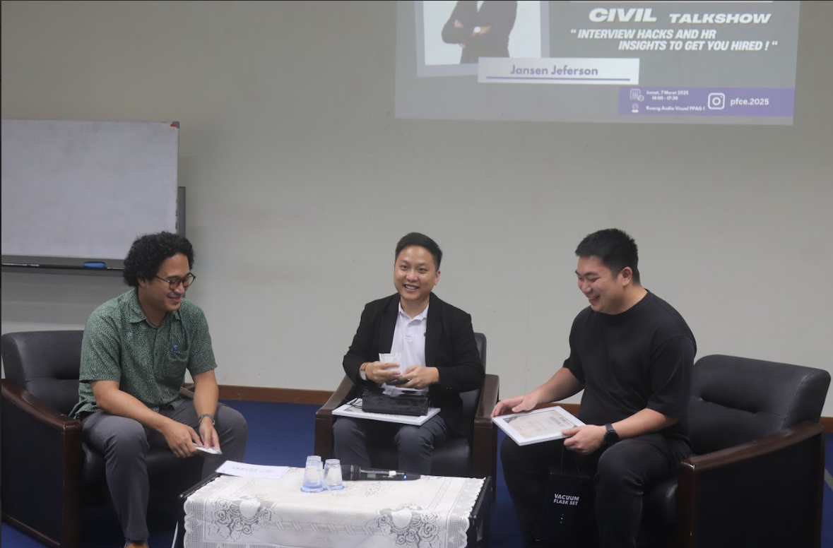 Civil Talkshow merupakan kegiatan yang mengundang narasumber untuk menyampaikan pengalamannya serta sharing terkait peluang dan strategi yang diperlukan dalam melakukan interview di dunia kerja dengan tema “Interview Hacks and HR Insights to Get You Hired.” Civil Talkshow dilaksanakan pada hari Jumat, 7 Maret 2025, dengan mengundang Senjaya Setianto sebagai moderator talkshow serta kedua narasumber yaitu, Richard Anggadiwirja dan Jansen Jefferson.